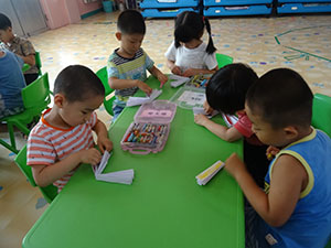 小五班孩子通过说一说的方式了解了扇子的结构和作用,利用白纸通过折、画、涂色的方式制作了美丽的折扇,锻炼了孩子们手的灵活性并能清楚的表达自己的想法。
