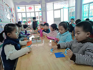 小朋友们拿着长方形卡纸,按照步骤图,先用剪刀剪去角,用油画棒进行装饰,最后用双面胶将“轮子”粘上,一辆小车就做好了。