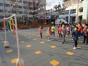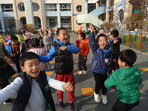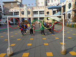 要进行比赛啦,小朋友可要加油啊!哇,投中啦!最后在一片欢呼中男生队投中的个数超过了女生队!男生,好棒!