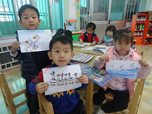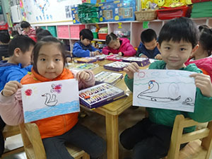 “鹅鹅鹅,曲项向天歌。白毛浮绿水,红掌拨清波…”看,小朋友根据古诗的内容描绘出了心目中的场景。哇,是大白鹅在碧绿的水面上。通过此次活动,使幼儿体会创作的快乐,激发幼儿而爱大自然的情感。