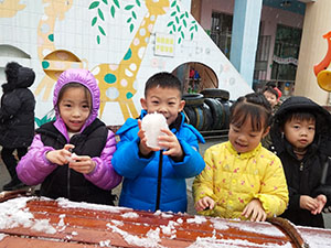 今天,小朋友见到今年的第一场雪都非常的高兴,看,小朋友用自己的小手在雪白的雪上写字呢。还有的小朋友团成了小雪球,小朋友玩的可真高兴。通过这次活动,可以让小朋友亲身感受到雪的色彩、雪的变化、雪球由小变大的过程,使幼儿对雪产生浓厚的兴趣和探究欲望。