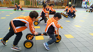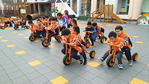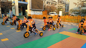 孩子们对新的户外玩具好奇的不得了,我们今天与孩子们共同感受骑车带来的乐趣,首先孩子们都挑选了自己喜欢的小车,听口令后,大家都一触即发,很使劲很努力的前进,游戏中孩子们还两两合作,进行带人骑车;孩子们开心极了;本次户外活动锻炼了幼儿四肢协调能力和合作能力。