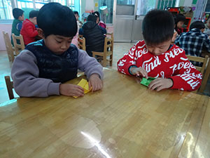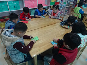 今天,大三班的小朋友进行了美工活动。小朋友通过自己灵巧的小手,折出了一个个的小电话。“喂,在吗?”“在呀,你在…”看,小朋友在和自己的小伙伴打电话呢。