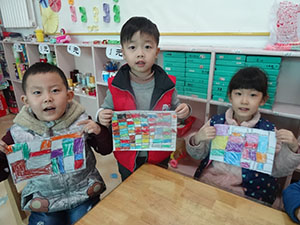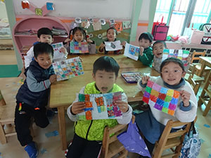 “小小格子,真好看。你画格子,涂彩色…”看,小朋友发动自己的小脑筋,用油画棒画出了美丽的格子画。好漂亮呀!