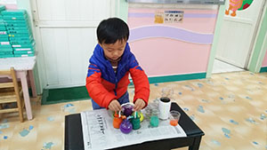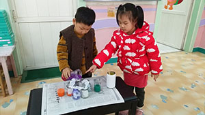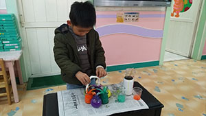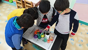 今天中一班的孩子们正在做一个神奇的实验,孩子们将六种颜色的颜料围城一个圆,将吸水力极强的卫生纸搓成长条,又将长条两端分别放入自己喜欢的颜料中,几秒钟的功夫,长条居然变出了第三种颜色,太神奇了。孩子们很好奇,纷纷进行探索。原来吸水纸将两种颜色吸到了一起,出现了颜色融到一起的现象。本次活动锻炼了幼儿的探索能力和动手动脑的能力。