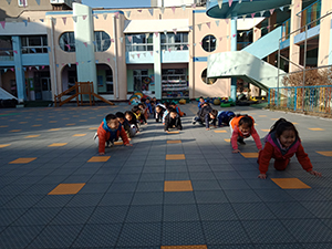 在游戏中,小朋友们学习长颈鹿跑和鳄鱼手脚着地屈膝爬的动作,看小朋友们学得多认真啊,玩得多高兴啊!