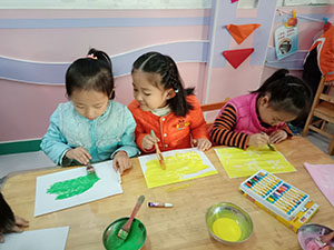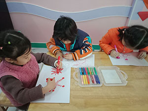 先认识了小雪花的形状,小朋友们就开始绘画了;一共分了两组,一组用彩色油画棒画彩色雪花,另一组用油水分离的方法画雪花。小朋友们根据想象画出雪花的花纹,一起感受冬日里雪花飘的景象。