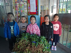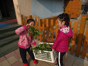 卖菠菜啦!看,小朋友变身售货员,一小捆一小捆的菠菜整齐的摆在教室门口,小朋友们兴奋地与家长互动,介绍自己的蔬菜,不仅感受到了种蔬菜的辛苦与快乐,还体验到自己的劳动成果得到回报的幸福感。