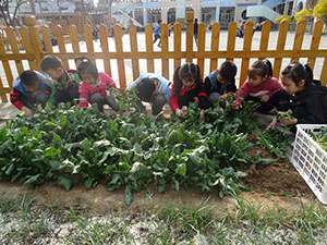 春天到了,天气变暖和了,大三班小朋友种的菠菜也长大了。老师带着小朋友们一起去菜地收菠菜。瞧!老师用工具将一棵棵大菠菜的根铲出来,我们再将这些菠菜从地里拨出来,抖抖土,整齐的摆到筐子里,由值日生将丰收的菠菜运走。