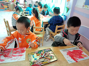 我们尝试了一种新的画法——油水分离法。小朋友先用油画棒画出自己喜欢的桃花,再用笔蘸适量的水粉颜料,将画面均匀罩染,我们的作品就完成了。小朋友们觉得好神奇,你们也可以尝试一下哟!