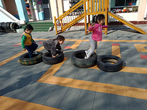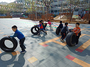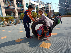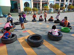 看,小朋友们玩的真高兴。有的在滚动轮胎,有的在跳跃轮胎,咦,还有的小朋友在玩“钻山洞”,从中间钻过来。最后,小朋友们还用轮胎玩了“打地鼠”的游戏,真棒!