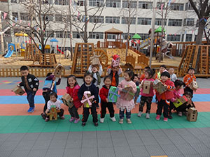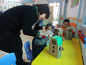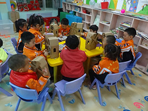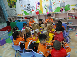 小二班宝贝们在老师们的带领和协助下,将半成品的纸工小屋制作得精致。清一色的牛皮纸色,让孩子们难以辨别。大家自由选取喜欢的水粉、水彩笔、油画棒、即时贴等材料,为风车小屋上色。没一会儿,清一色的风车小屋都焕然一新,变得更加春意盎然、色彩绚烂。