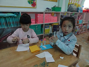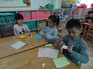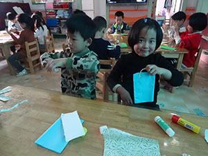 今天我们大三班用彩纸做了环保手提袋。通过粘贴、折叠做出纸袋,再通过拧、搓做出提手,最后通过撕、粘贴、涂画装饰纸袋,就完成了。本次活动提高了小朋友的动手能力,做好的小纸袋可以装小物品,这可真有意思呢。