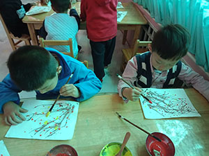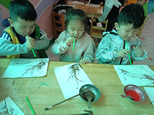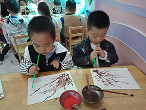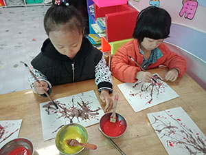 先将棕色颜料用毛笔滴在画纸上,手拿吸管用嘴将一滴滴颜料吹成放射状,树干就完成了。然后小朋友用毛笔点出花瓣,有红色、橙色、黄色,一幅漂亮的吹画就完成了!你们看,是不是很漂亮呢。