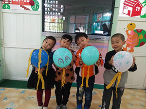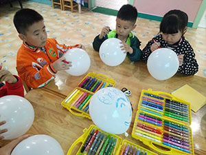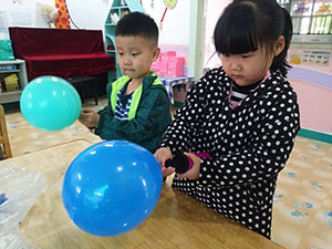 结合主题“空气的秘密”,孩子们收集了很多五颜六色的气球,用打气筒将气球充满空气,再用各种材料装饰气球,有的用油画棒进行添画,有的用皱纹纸进行黏贴,孩子们创意无限,想象力丰富。本次活动中幼儿不仅了解到气球里面有空气,同时也锻炼了幼儿动手操作能力。
