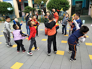 旋转小飞人--------小朋友,这里有一张长方形的纸条,你能让它旋转起来吗?怎么做才能让它旋转着飞起来呢!下面让我们一起制作一个旋转小飞人吧!小朋友们带着自己制作好的旋转小飞人开心地来到户外,1.2.3.起飞啦!小朋友们高兴的跳着往高空中扔旋转小飞人,看着一个个的旋转小飞人从空中落了下来,心里开心极了!