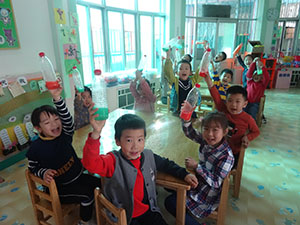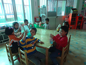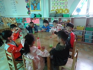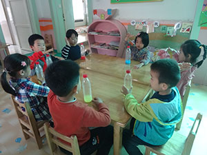 你知道小精灵的魔法汤吗?那是一个神奇的水瓶,只要你轻轻一晃,里面的清水就会变出漂亮的颜色。我们大三班的小朋友也学会了这个魔术啦!先把瓶盖上涂上颜料,再把瓶盖在瓶子上拧紧,轻轻一晃,“魔法汤”就完成了。我们还尝试着配上音乐,根据音乐的节奏想象一下小精灵施魔法的情境,用肢体动作表达渐强、渐快的旋律,晃动我们手中的“魔法汤”,这可真有意思呀!