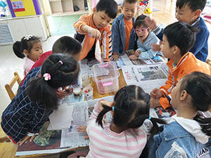 小朋友们知道彩色的颜料滴入水中会发生什么样的变化吗?如果在滴入颜料的水面平铺上一张纸又会怎么样呢?带着这些疑问,我们开始制作湿拓画。什么是拓印——是把纸轻轻的铺在水面,然后轻轻的拉起来,就叫拓印。小朋友一起动手操作一下吧!原来,在水上轻轻地滴一滴、慢慢划一划,再用纸拓印出来,就能做出神奇的湿拓画呀!