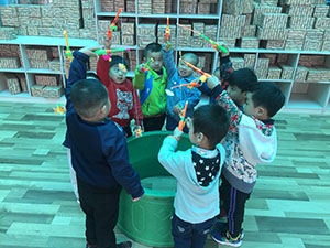 小朋友们发现了活动室里出现了好多好多的小鱼,旁边放着一个个的鱼竿,鱼钩上的有吸铁石,可是小鱼是卡片的,要怎么才能钓上来呢?我们一起讨论,最后决定用我们活动室已有材料曲别针来完成,将每个小鱼身上都别上彩色的曲别针,那样吸铁石就能将小鱼轻松钓起来了!大家齐心合力,很快小鱼们游到了池塘里,我们一起钓鱼啦!