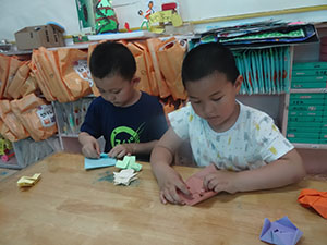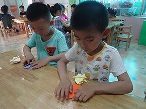 你喜欢折纸吗?我们大三班的小朋友最喜欢折纸了!夏天了,炎热的太阳挂在天上,好晒呀,今天我们就折了一个清凉的“小亭子”。瞧!有了“小亭子”,我们就不怕热了。接下来,老师要带着我们“变魔术”了,将“小亭子”倒过来,就变成了一个小人的“头”,再折出上衣和裤子,看!滑稽小人做好了。画上眼睛嘴巴,真可爱!