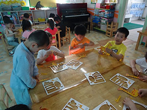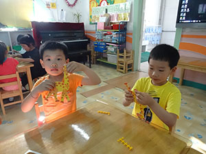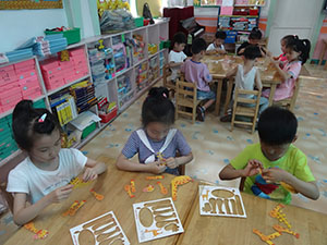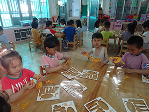 今天我们大三班的小朋友要来做长颈鹿。“小鸡蛋大鸭蛋,中间两条电话线,鸡蛋头上长出角,两只耳朵凑热闹。”根据有趣的儿歌,我们迅速的用卡片拼出了可爱的长颈鹿。看!长颈鹿有长长的脖子,细细的腿,和一条短短的尾巴。由于卡片之间是由按扣固定的,所以我们的长颈鹿还会动呢!小朋友们自由操作会动的长颈鹿,拼摆出不同的形态,瞧!长颈鹿弯弯腰、低低头,仿佛在说:小朋友们好!