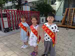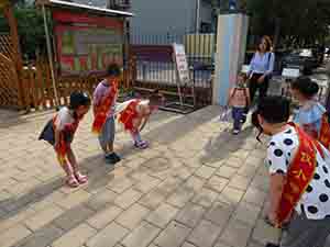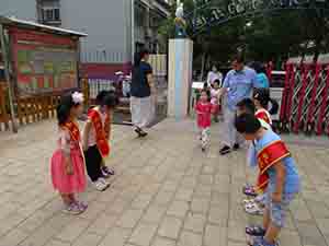 我们大三班的小朋友来当礼仪小标兵了。我们怀着兴奋地心情早早来到幼儿园,戴上“礼仪小标兵”的标志,站在幼儿园门口迎接到来的小朋友们。每当有小朋友和叔叔阿姨进门,我们大声地向他们问好,心里甜甜的,很光荣。当小朋友们和叔叔阿姨也向我们问好的时候,我们心里可幸福了,以后还要争做礼仪小标兵。
