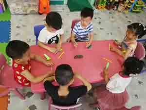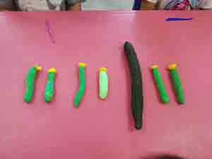 小三班的小朋友用橡皮泥来做黄瓜了,孩子们仿照黄瓜实物,团一团,擀一擀,新鲜的黄瓜就做成了,大家还给黄瓜做了花呢,看!我们做的黄瓜像不像?