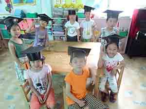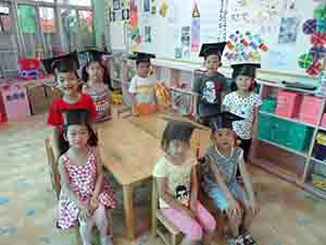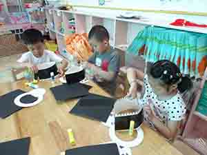 今天我们大三班的小朋友要做一个神气的黑色帽子——博士帽。帽子是用黑色的卡纸做成的,其中包括一张锯齿状的长方形卡纸、一张比较大的正方形卡纸和一张固定帽圈的圆纸片。小朋友们特别认真、细心,涂上胶棒后捏住固定一会,把接口粘的牢牢实实的。看!我们的博士帽好看吗?