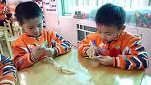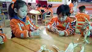 秋天是收获的季节,孩子们纷纷来掰玉米,玉米皮则成为孩子们游戏活动的天然材料,首先挑选干净平滑的玉米皮,然后交错编织,最后涂上漂亮的颜色,一条条五彩的小辫子就完成啦!
