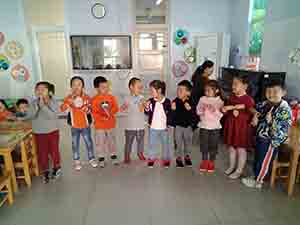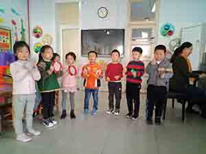 小朋友们熟悉歌曲的节奏后,开始探索用打击乐器进行演奏,小朋友们都可棒了,演奏的非常动听。最后,我们增加难度,让小朋友用动作来表现乐曲:找果园、摘苹果、举箩筐,小朋友们都学得可高兴了!